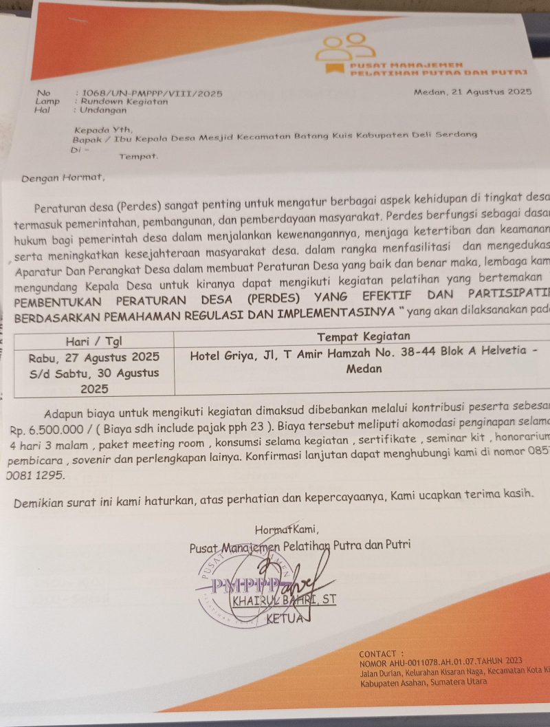 Kontroversi kembali mencuat terkait kegiatan bimbingan teknis (bimtek) yang menyasar perangkat desa di Kabupaten Deli Serdang. Setelah satu dekade pengelolaan keuangan desa berjalan, aparatur desa kembali “dicekoki” dengan agenda bimtek yang terkesan merendahkan kualitas SDM mereka. Kegiatan bertajuk “Pembentukan Peraturan Desa (Perdes) yang Efektif dan Partisipatif Berdasarkan Pemahaman Regulasi dan Implementasinya” ini menuai kecaman dari berbagai pihak.