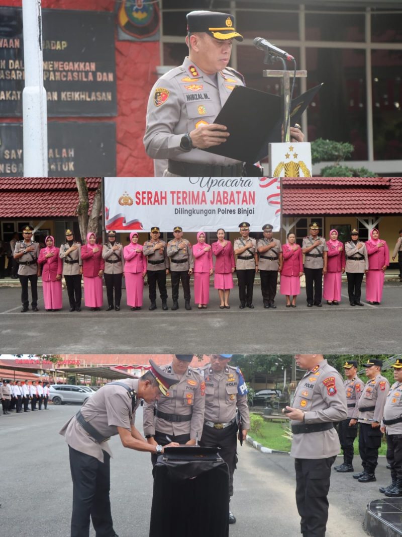 Kapolres Binjai AKBP Mirzal Maulana, S.I.K., S.H., M.M., M.H., secara langsung memimpin pelaksanaan serah terima jabatan Pejabat Utama (PJU) lingkup Polres Binjai. Acara berlangsung di Lapangan Apel Polres Binjai, Jalan Sultan Hasanuddin No.1 Kelurahan Satria Kecamatan Binjai Kota, Provinsi Sumatera Utara, pada Senin (19/01/2026) pukul 16.00 WIB.