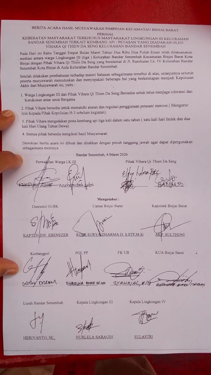 Mediasi perdana konflik Klenteng Thai Seng Hut Co di Binjai Barat bersama Warga lingkungan 3 yang digelar pada Rabu (4/3/26) dihadiri langsung oleh Ketua Pengurus Klenteng Elton Hotman bersama rekannya dan kubu warga yang berseteru di Kantor Kelurahan Bandar Sinembah, Kec. Binjai Barat, Kota Binjai.