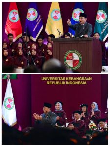 Presiden Prabowo berpesan kepada para wisudawan untuk selalu memilih jalan yang benar dan berpegang teguh pada integritas. “Jadi saudara-saudara, anak-anak muda harapan kita. Waspada selalu menatap masa depan dengan berani, tapi juga dengan waspada. Waspada, jangan mudah dibohongi,” tegasnya.