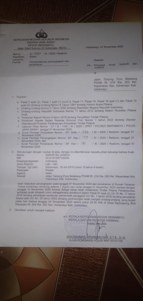 Surat penetapan anak nomor : B/5678/XI/2025/Reskrim serta surat Pemberitahuan Penangkapan dan Penahanan (SPDPP) dengan nomor B/5682/XI/2025/Reskrim baru diserahkan kepada perwakilan orang tua S pada tanggal 8 November 2025, padahal penangkapan dan penahanan sudah dilakukan sejak tanggal 6 November 2025 sedangkan unit PPA polres indramayu menerima laporan polisi dari pelapor ditanggal 7 November 2025 sesudah dilakukan penangkapan dan penahanan.